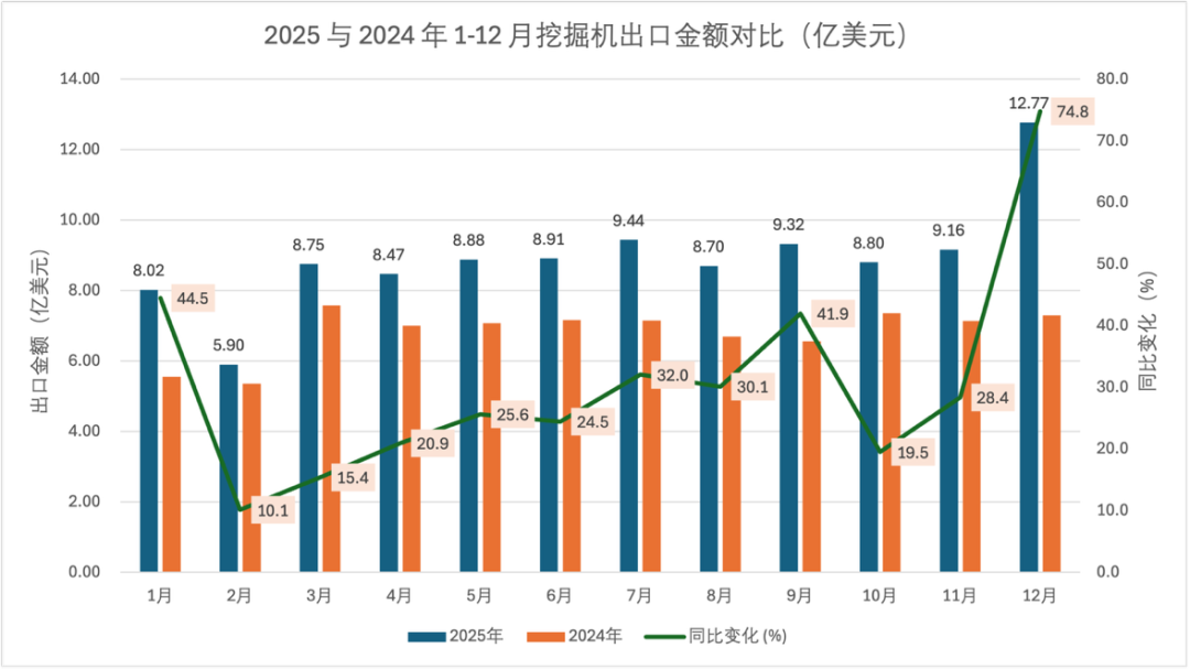 Z měsíčních údajů vyplývá, že exportní výkonnost pásových rypadel úzce souvisí s celkovým trhem, přičemž hodnota exportu za jeden měsíc v prosinci činila 1,228 miliardy dolarů, což představuje 74,0% meziroční nárůst, a objem exportu 34 000 kusů, meziročně o 65,0% více, což na konci roku vykazuje významné tempo růstu. Pokud jde o meziroční změny, hodnota exportu i objem dosáhly pozitivního růstu ve všech měsících, když objem v září vzrostl o 57,9 % a hodnota v prosinci o 74,0 %, což jsou hlavní vrcholy růstu roku.