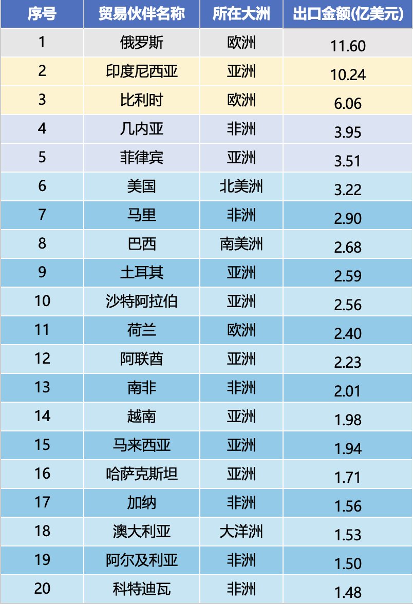 Podle žebříčku objemu exportu od ledna do prosince 2025 jsou prvními deseti obchodními partnery Rusko (1,16 miliardy USD), Indonésie (1,024 miliardy USD), Belgie (606 milionů USD), Guinea (395 milionů USD), Filipíny (351 milionů USD), Spojené státy americké (322 milionů USD), Mali (290 milionů USD), Brazílie (268 milionů USD), Brazílie (268 milionů USD, Saudská Arábie (256 milionů USD). milionů). Celková hodnota exportu deseti největších trhů dosáhla 4,93 miliardy amerických dolarů, což představuje 45,9 % celkové hodnoty exportu, s vysokou koncentrací na hlavním trhu.