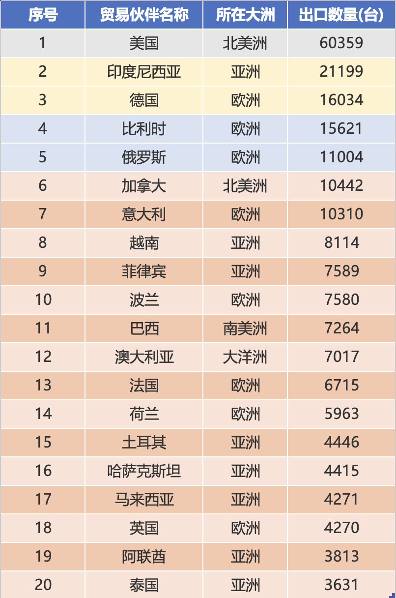 Podle žebříčku množství exportu od ledna do prosince 2025 jsou prvními deseti obchodními partnery Spojené státy americké (60359 jednotek), Indonésie (21199 jednotek), Německo (16034 jednotek), Belgie (15621 jednotek), Rusko (11004 jednotek), Kanada (10442 jednotek), Itálie (10310 jednotek), Vietnam (8114 jednotek 80 jednotek), Polsko (8114 jednotek 850 jednotek), Filipíny (8114 jednotek 5 jednotek). Celkové množství exportu z deseti největších trhů dosáhlo 168 000 jednotek, což představuje 53,1 % z celkového množství exportu, což zdůrazňuje efekt rozsahu.